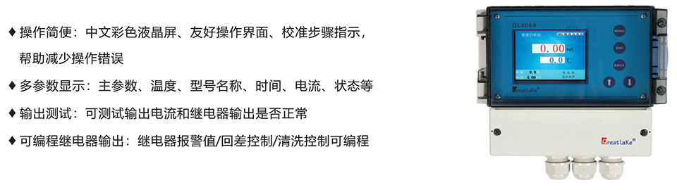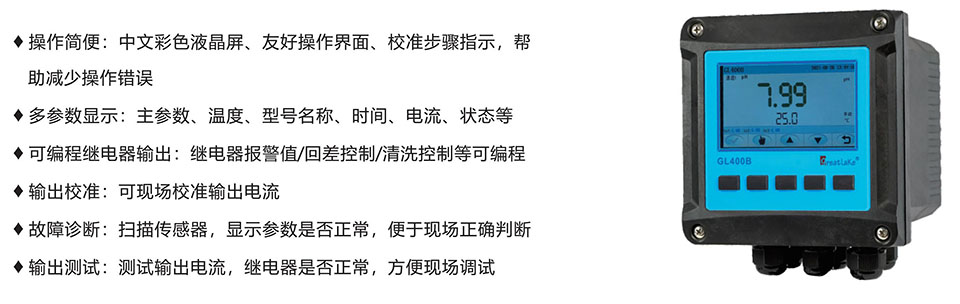 產(chǎn)品簡(jiǎn)介: 智能分析儀GL400B的產(chǎn)品特點(diǎn):中文彩色液晶屏、友好操作界面、校準(zhǔn)步驟指示,幫 助減少操作錯(cuò)誤;主參數(shù)、溫度、型號(hào)名稱、時(shí)間、電流、狀態(tài)等;繼電器報(bào)警值/回差控制洗控制等可編程;可現(xiàn)場(chǎng)校準(zhǔn)輸出電流;掃描傳感器,顯示參數(shù)是否正常,便于現(xiàn)場(chǎng)正確判斷;測(cè)試輸出電流,繼電器是否正常,方便現(xiàn)場(chǎng)調(diào)試